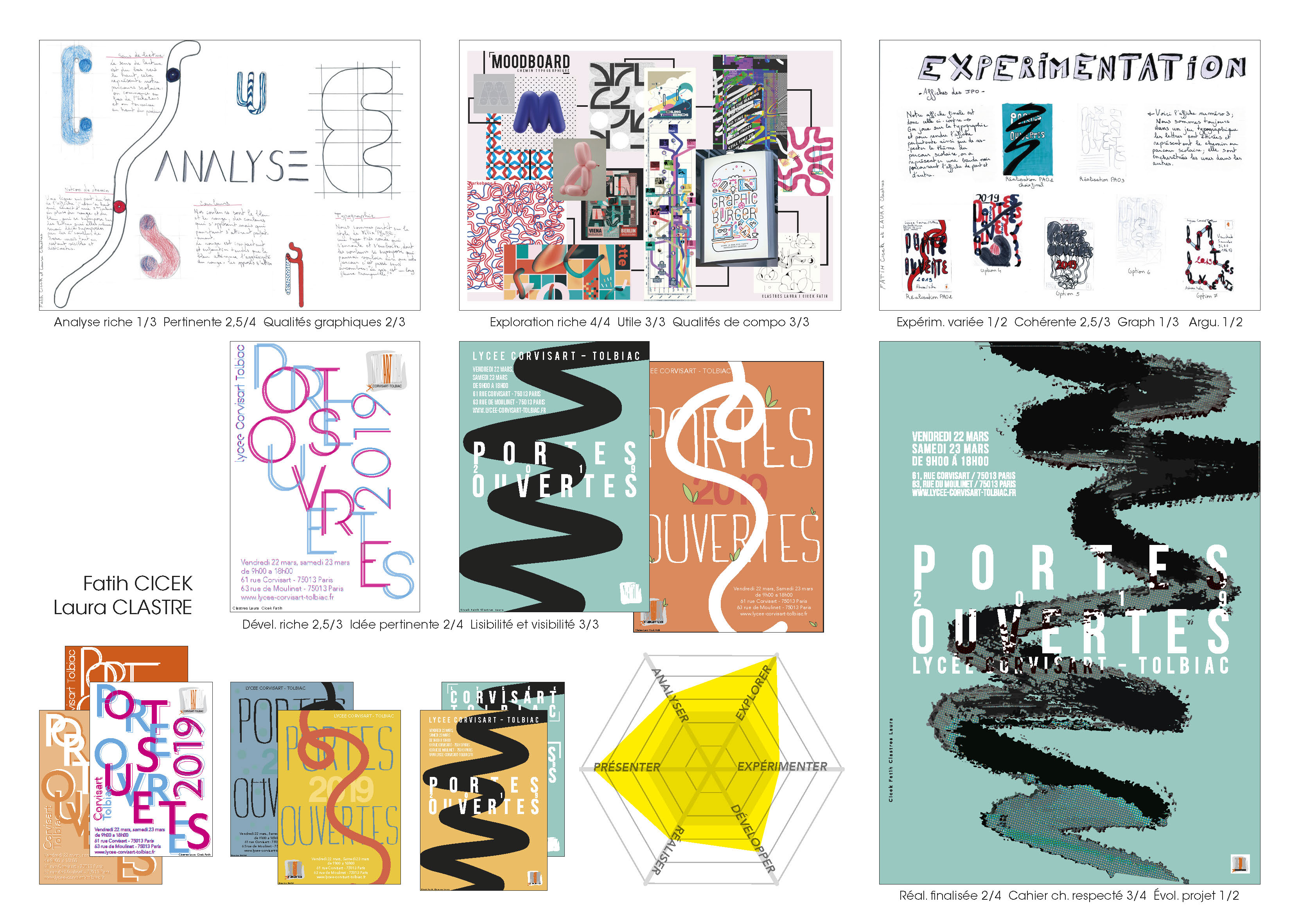 Cette année, l'affiche de nos portes ouvertes a été réalisée par les TCV.B durant les ateliers de la semaine de rentrée. Les élèves ont axé leur travail autour de la notion de parcours (scolaires, professionnels, de vie, etc.). Ils ont travaillé en binôme selon une démarche définie ensemble : une analyse graphique, une planche d'inspiration, des recherches, une mise au point numérique et une présentation orale. Vous pourrez voir la production de chaque groupe dans la galerie ci-après. La classe a eu la chance d'accueillir trois anciens élèves de Corvisart, maintenant jeunes diplômés de l'école Estienne. Ces derniers sont venus apporter leur expertise et leur aide à nos terminales. L'affiche lauréate a été choisie par les représentants élus du lycée (direction, enseignants, parents, élèves, mais aussi agents) lors du CA du mardi 4 décembre.